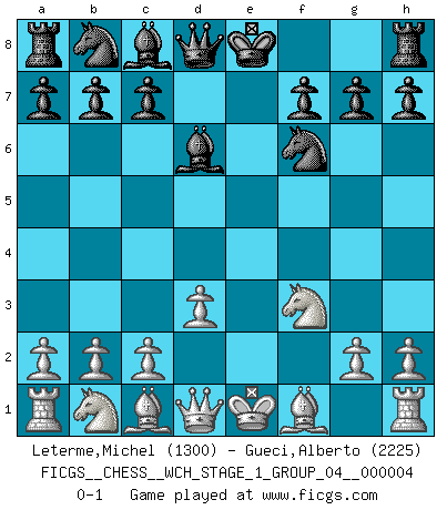 Last move : 0-1 2008 February 16 1:32:50 [Event "FICGS__CHESS__WCH_STAGE_1_GROUP_04__000004"] [Site "FICGS"] [Date "2008.01.08"] [Round "1"] [White "Leterme,Michel"] [Black "Gueci,Alberto"] [Result "0-1"] [WhiteElo "1300"] [BlackElo "2225"] 1.f4 e5 2.fxe5 d6 3.exd6 Bxd6 4.Nf3 Nf6 5.e4 Nxe4 6.d3 Nf6 0-1 This chess game has been lost on time (started : 2008.01.08 19:44:47) Bird : From gambit Player Black won this chess game. Follow this game move after move (download)There is only one thing Fischer does in Chess without pleasure: to lose ! (Boris Spassky) Ich würde mich als ganz normalen Jungen bezeichnen [Im Alter von 12]. (Sergej Karjakin) De eso se trata el Ajedrez. Un día le das una lección a tu oponente y al día siguiente el te da una a tí. (Bobby Fischer) Celui qui prend des risques peut perdre, celui qui n'en prend pas perd toujours. (Xavier Tartacover) There are two kinds of tragedy in this world, one is not getting what you want and the other is getting. (Lord of war)