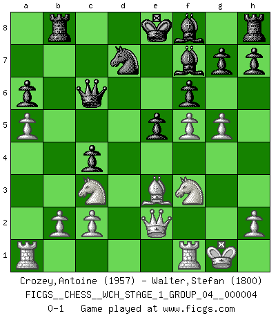 Last move : 0-1 2008 March 17 4:26:7 [Event "FICGS__CHESS__WCH_STAGE_1_GROUP_04__000004"] [Site "FICGS"] [Date "2008.01.08"] [Round "1"] [White "Crozey,Antoine"] [Black "Walter,Stefan"] [Result "0-1"] [WhiteElo "1957"] [BlackElo "1800"] 1.e4 c5 2.Nf3 d6 3.d4 cxd4 4.Nxd4 Nf6 5.Nc3 a6 6.Be3 e6 7.f3 b5 8.Qd2 Nbd7 9.g4 Nb6 10.a4 Nc4 11.Bxc4 bxc4 12.a5 Bb7 13.Na4 d5 14.g5 Nd7 15.exd5 Bxd5 16.O-O Qc7 17.f4 Rb8 18.f5 e5 19.Nf3 Qc6 20.Qe2 f6 21.Nc3 Bf7 0-1 This chess game has been lost on time (started : 2008.01.08 19:44:47) Sicilian : Najdorf, Byrne (English) attack Kingside Castling by player White (move 16) Player Black won this chess game. Follow this game move after move (download)Chess, like love, is infectious at any age. (Flohr) Vielleicht wirkt die Aura früherer Spieler glanzvoller als die der heutigen Spieler, aber das liegt daran, dass man kein Programm wie Fritz hatte, das einem all die Löcher in ihren Partien zeigt. (Vladimir Kramnik) Aunque la mayoría de la gente disfruta observar las partidas de los grandes Maestros de ataque, algunos de los jugadores mas notables en la historia han sido los jugadores silenciosos posicionales. Lentamente ellos te aplastan despojandote de tu espacio, congestionando tus piezas y dejandote virtualmente sin nada que hacer. (Yasser Seirawan) 'L'échange des dames est un coup dur pour les deux adversaires...' Un journaliste lors d'une partie du match Spassky-Fischer It's only after you lost everything, Tyler says, that you're free to do anything. (Chuck Palahniuk, Fight Club)