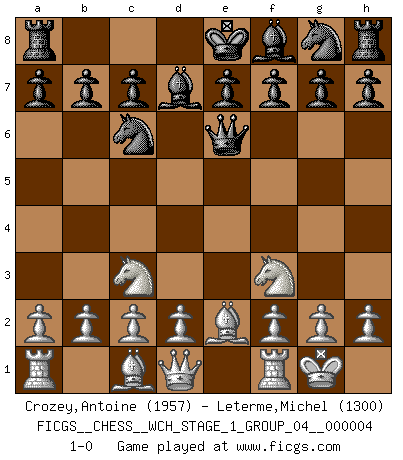 Last move : 1-0 2008 February 16 13:33:54 [Event "FICGS__CHESS__WCH_STAGE_1_GROUP_04__000004"] [Site "FICGS"] [Date "2008.01.08"] [Round "1"] [White "Crozey,Antoine"] [Black "Leterme,Michel"] [Result "1-0"] [WhiteElo "1957"] [BlackElo "1300"] 1.e4 d5 2.exd5 Qxd5 3.Nc3 Qe6+ 4.Be2 Bd7 5.Nf3 Nc6 6.O-O 1-0 This chess game has been lost on time (started : 2008.01.08 19:44:47) Scandinavian (centre counter) defense Kingside Castling by player White (move 6) Player White won this chess game. Follow this game move after move (download)As one by one I mowed them down, my superiority soon became apparent. (Jose Capablanca) Frage des Reporters: -Worin besteht das Ziel von Gambiteröffnungen? Antwort: -Auf Kosten der Partie einen Ruf als Angriffspieler zu erwerben.- (Siegbert Tarrasch) Hay jugadores fuertes y personas amables y yo soy un jugador fuerte. (Bobby Fischer) Votre prénom est 'Tactique', votre deuxième prénom est 'Tactique' et votre nom est 'Tactique'. (Ken Smith) I find your interest interesting. (Gregory House, House M.D.)