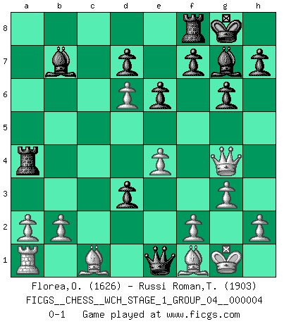 Last move : 0-1 2008 February 9 8:4:49 [Event "FICGS__CHESS__WCH_STAGE_1_GROUP_04__000004"] [Site "FICGS"] [Date "2008.01.08"] [Round "1"] [White "Florea,Oscar"] [Black "Russi Roman,Tano-Urayoan"] [Result "0-1"] [WhiteElo "1626"] [BlackElo "1903"] 1.d4 Nf6 2.c4 c5 3.d5 b5 4.cxb5 a6 5.bxa6 Bxa6 6.Nc3 g6 7.Nf3 Bg7 8.d6 e6 9.g3 Qb6 10.Bg2 Nc6 11.O-O O-O 12.Re1 Bb7 13.e4 Ng4 14.Qc2 Nd4 15.Nxd4 cxd4 16.Na4 Qb4 17.Qd1 d3 18.Qxg4 Qxe1+ 19.Bf1 Rxa4 0-1 Benko gambit accepted Kingside Castling by player White (move 11) Kingside Castling by player Black (move 11) Player Black won this chess game. Follow this game move after move (download)Chess is the art which expresses the science of logic. (Mikhail Botvinnik) Alles was ich jemals tun will ist Schach spielen. (Robert James Fischer) Por la belleza de sus partidas, la claridad de su juego y lo brillante de sus ideas, Fischer se creó el mismo como un artista de la misma estatura como Brahms, Rembrandt y Shakespeare. (David Levy) Aucun coup ne doit être joué sans but. (Pedro Damiano) The beginning is the most important part of the work. (Plato)