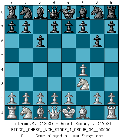 Last move : 0-1 2008 February 21 1:54:38 [Event "FICGS__CHESS__WCH_STAGE_1_GROUP_04__000004"] [Site "FICGS"] [Date "2008.01.08"] [Round "1"] [White "Leterme,Michel"] [Black "Russi Roman,Tano-Urayoan"] [Result "0-1"] [WhiteElo "1300"] [BlackElo "1903"] 1.f4 c6 2.Nf3 g6 0-1 This chess game has been lost on time (started : 2008.01.08 19:44:47) Bird's Opening Player Black won this chess game. Follow this game move after move (download)I give 98 percent of my mental energy to Chess. Others give only 2 percent. (Bobby Fischer) Gegen einen Schachcomputer zu verlieren ist wie Löcher in den Strümpfen zuhaben. Es ist nicht peinlich, solange man der einzige ist der es weiß. (Anonymous) Debemos de asegurarnos de que el Ajedrez no se convierta en un lenguaje muerto, muy interesante, pero tan solo para un grupo muy pequeño. (Sytze Faber) Mais n'est-ce pas déjà le limiter injurieusement que d'appeler les échecs un jeu? N'est-ce pas aussi une science, un art, ou quelque chose qui, comme le cercueil de Mahomet entre ciel et terre, est suspendu entre l'un et l'autre, et qui réunit un nombre incroyable de contraires ? (Stefan Zweig) But they are useless. They can only give you answers. (Pablo Picasso, about computers)