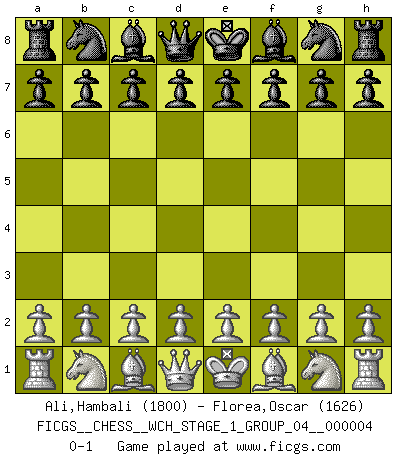 Last move : 0-1 2008 February 8 12:51:40 [Event "FICGS__CHESS__WCH_STAGE_1_GROUP_04__000004"] [Site "FICGS"] [Date "2008.01.08"] [Round "1"] [White "Ali,Hambali"] [Black "Florea,Oscar"] [Result "0-1"] [WhiteElo "1800"] [BlackElo "1626"] 0-1 This chess game has been lost on time (started : 2008.01.08 19:44:47) Player Black won this chess game. Follow this game move after move (download)Play the opening like a book, the middle game like a magician, and the endgame like a machine. (Spielmann) Taktik ist was man tun muß, wenn etwas zu tun ist. Strategie ist was man tun muß, wenn nichts zu tun ist. (Savielly Grigorievitsch Tartakower) Tu cuerpo tiene que estar en óptima condición. Tu Ajedrez se deteriora como lo hace tu cuerpo. No puedes separar la mente y el cuerpo. (Bobby Fischer) RxDa4 pat (...) A woman without a man is like a fish without a bicycle. (Gloria Steinem)