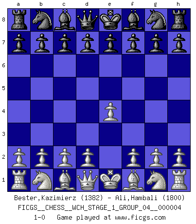 Last move : 1-0 2008 February 9 12:55:24 [Event "FICGS__CHESS__WCH_STAGE_1_GROUP_04__000004"] [Site "FICGS"] [Date "2008.01.08"] [Round "1"] [White "Bester,Kazimierz"] [Black "Ali,Hambali"] [Result "1-0"] [WhiteElo "1382"] [BlackElo "1800"] 1.e4 1-0 This chess game has been lost on time (started : 2008.01.08 19:44:47) King's pawn Opening Player White won this chess game. Follow this game move after move (download)A man without frontiers. He didn't divide the East and the West, he brought them together in their admiration for him. (Ljubomir Ljubojevic, about Bobby Fischer's death) Aljechin war kein Nazi. Er war ein Opportunist. Ein schrecklicher Mann. Er liebte Geld über alles und würde für Geld ein Jude, ein Katolik oder ein Protestant werden. (Miguel Najdorf) Nada excita más a Grandes Maestros aburridos que una novedad teórica. (Dominic Lawson) Karpov est une pièce de musée. (Garry Kasparov) There's no money in correspondence chess. (John Knudsen)