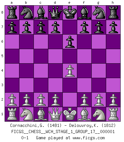 Last move : 0-1 2006 August 14 17:38:4 [Event "FICGS__CHESS__WCH_STAGE_1_GROUP_17__000001"] [Site "FICGS"] [Date "2006.07.01"] [Round "1"] [White "Cornacchini,Gabriele"] [Black "Delouvroy,Kael"] [Result "0-1"] [WhiteElo "1481"] [BlackElo "1812"] 1.e4 e6 0-1 This chess game has been lost on time (started : 2006.07.01 16:25:41) French defense Player Black won this chess game. Follow this game move after move (download)Chess is no whit inferior to the violin, and we have a large number of professional violinists. (Mikhail Botvinnik) Wie gewinnt Tal? Er entwickelt alle seine Figuren in die Brettmitte und opfert sie dann irgendwo. (Robert James Fischer) La táctica fluye a partir de una posición superior. (Bobby Fischer) Les Echecs ont trois composantes : le temps, l'espace et le matériel en dernier. (Mikhail Tal) Unless I accept my faults I will most certainly doubt my virtues. (Hugh Prather)