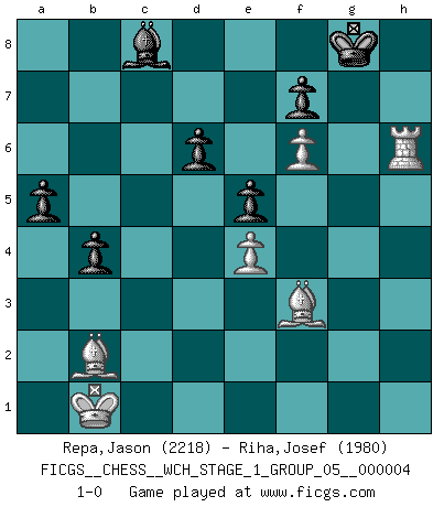 Last move : 1-0 2008 February 7 0:21:37 [Event "FICGS__CHESS__WCH_STAGE_1_GROUP_05__000004"] [Site "FICGS"] [Date "2008.01.08"] [Round "1"] [White "Repa,Jason"] [Black "Riha,Josef"] [Result "1-0"] [WhiteElo "2218"] [BlackElo "1980"] 1.e4 c5 2.Nf3 d6 3.d4 cxd4 4.Nxd4 Nf6 5.Nc3 Nc6 6.Bg5 e6 7.Qd2 a6 8.O-O-O h6 9.Be3 Be7 10.f3 Nxd4 11.Qxd4 O-O 12.g4 Nd7 13.h4 b5 14.g5 h5 15.f4 Qa5 16.Kb1 b4 17.Ne2 e5 18.Qd2 Nc5 19.Bg2 Be6 20.b3 Bg4 21.f5 Rac8 22.f6 gxf6 23.Ng3 fxg5 24.hxg5 Rc7 25.Nxh5 Na4 26.bxa4 Qxa4 27.Nf6+ Bxf6 28.gxf6 Be6 29.Bd4 Qxa2+ 30.Kc1 Rxc2+ 31.Qxc2 Rc8 32.Qxc8+ Bxc8 33.Bb2 Qe6 34.Rh6 Qg4 35.Rdh1 Qg5+ 36.Kb1 Qxh6 37.Rxh6 a5 38.Bf3 1-0 Sicilian : Richter-Rauzer, Rauzer attack, 7...a6 Queenside Castling by player White (move 8) Kingside Castling by player Black (move 11) Player White won this chess game. Follow this game move after move (download)Later, I began to succeed in decisive games. Perhaps because I realized a very simple truth: not only was I worried, but also my opponent. (Mikhail Tal) Schachspieler können ausgezeichnet Varianten am Schachbrett berechnen, aber nicht im realen Leben. Zu stark ist der Individualismus im Schach ausgeprägt, und für viele ist ein kleiner momentaner persönlicher Vorteil wichtiger als ein weit größerer Vorteil von morgen. (Anatoly Karpov) Antes de los Finales, los dioses han colocado el Juego Medio. (Siegbert Tarrasch) Karpov est une pièce de musée. (Garry Kasparov) The worth of a book is to be measured by what you can carry away from it. (James Bryce)
