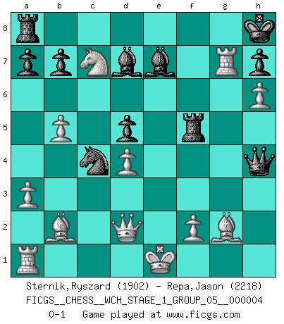 Last move : 0-1 2008 February 9 22:16:4 [Event "FICGS__CHESS__WCH_STAGE_1_GROUP_05__000004"] [Site "FICGS"] [Date "2008.01.08"] [Round "1"] [White "Sternik,Ryszard"] [Black "Repa,Jason"] [Result "0-1"] [WhiteElo "1902"] [BlackElo "2218"] 1.e4 e6 2.d4 d5 3.e5 c5 4.c3 Nc6 5.Nf3 Qb6 6.a3 Nh6 7.b4 cxd4 8.cxd4 Nf5 9.Bb2 Be7 10.h4 O-O 11.g4 Nh6 12.Rg1 Bd7 13.Nc3 f5 14.exf6 Rxf6 15.Na4 Qc7 16.g5 Rxf3 17.gxh6 Qf4 18.Rxg7+ Kh8 19.Qd2 Qxh4 20.Nc5 Be8 21.Bg2 Rf5 22.Nxe6 Bd7 23.b5 Na5 24.Nc7 Nc4 0-1 French : Advance, Paulsen attack Kingside Castling by player Black (move 10) Player Black won this chess game. Follow this game move after move (download)I like the moment when I break a man's ego. (Bobby Fischer) Unter Putin wird alles Geld aus Russland wie von einem Staubsauger nach Moskau umgeleitet, das ist wie ein schwarzes Loch. (Garry Kasparov) El pensamiento metódico es mas útil en el Ajedrez que la inspiración. (C. J. S. Purdy) Avec des compensations pour le matériel en plus... (Anonyme) First of all, we have to go back to the classical time control. (Anatoly Karpov)