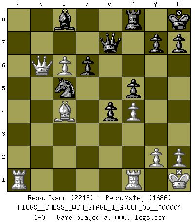 Last move : 1-0 2008 May 18 2:27:28 [Event "FICGS__CHESS__WCH_STAGE_1_GROUP_05__000004"] [Site "FICGS"] [Date "2008.01.08"] [Round "1"] [White "Repa,Jason"] [Black "Pech,Matej"] [Result "1-0"] [WhiteElo "2218"] [BlackElo "1686"] 1.e4 c5 2.Nf3 Nc6 3.d4 cxd4 4.Nxd4 Nf6 5.Nc3 e5 6.Ndb5 d6 7.Nd5 Nxd5 8.exd5 Nb8 9.c4 a6 10.Nc3 Be7 11.Be2 O-O 12.O-O f5 13.Bd2 Nd7 14.Rc1 Qb6 15.b4 Qd4 16.Qc2 Qh4 17.f4 e4 18.Na4 a5 19.bxa5 Bd8 20.c5 Bxa5 21.Bxa5 Rxa5 22.c6 Nc5 23.Nb6 bxc6 24.Nc4 Qd8 25.Nxa5 Qxa5 26.dxc6 Qb6 27.Qb1 Qa7 28.Bc4+ Kh8 29.Kh1 Qc7 30.a4 Nxa4 31.Qb5 Nc5 32.Ra1 Qe7 33.Qb6 1-0 Sicilian : Pelikan (Lasker/Sveshnikov) variation Kingside Castling by player Black (move 11) Kingside Castling by player White (move 12) Player White won this chess game. Follow this game move after move (download)We must make sure that Chess will not be like a dead language, very interesting, but for a very small group. (Sytze Faber) Frage: Was machen Sie mit den Preisen? Anwort: Ich habe Angst, dass meine Freundin davon neue Kleider kauft. (Loek van Wely) El Ajedrez es realmente noventa y nueve por ciento calculación. (Soltis) On peut tirer plus d'utilité d'une partie perdue que de 100 parties gagnées. (Capablanca) If only faces could talk... (Pat Summerall, Sportscaster during the Super Bowl)