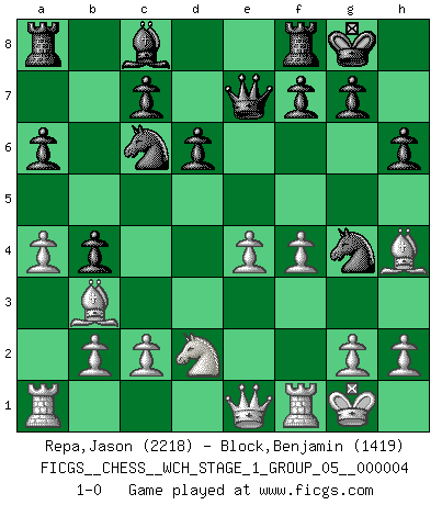 Last move : 1-0 2008 January 22 18:4:8 [Event "FICGS__CHESS__WCH_STAGE_1_GROUP_05__000004"] [Site "FICGS"] [Date "2008.01.08"] [Round "1"] [White "Repa,Jason"] [Black "Block,Benjamin"] [Result "1-0"] [WhiteElo "2218"] [BlackElo "1419"] 1.e4 e5 2.Nf3 Nc6 3.Bb5 a6 4.Ba4 Nf6 5.O-O b5 6.Bb3 Bc5 7.a4 b4 8.Nxe5 Nxe5 9.d4 Bxd4 10.Qxd4 Qe7 11.Bg5 Nc6 12.Qe3 h6 13.Bh4 O-O 14.Nd2 d6 15.f4 Ng4 16.Qe1 1-0 Ruy Lopez : 5.O-O Kingside Castling by player White (move 5) Kingside Castling by player Black (move 13) Player White won this chess game. Follow this game move after move (download)We must make sure that Chess will not be like a dead language, very interesting, but for a very small group. (Sytze Faber) Modernes Schach erfordert enorme Anspannung. Es ist für einen normalen Menschen unmöglich das auszuhalten. (Viktor Kortschnoi) Me dio la sensación de como si yo estuviera jugando en contra del mismo Ajedrez. - al estar jugando en contra de Robert Fischer (Walter Shipman) Des points faibles ou des trous dans la position de l'adversaire doivent être occupés par des pièces et non pas par des pions. (Siegbert Tarrasch) Live, lose, and learn, by observing your opponent how to win. (Amber Steenbock)