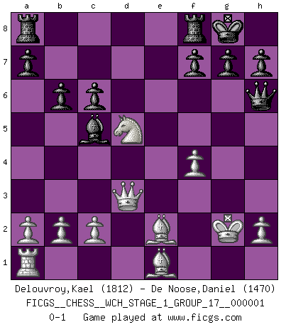 Last move : 0-1 2006 October 24 7:42:14 [Event "FICGS__CHESS__WCH_STAGE_1_GROUP_17__000001"] [Site "FICGS"] [Date "2006.07.01"] [Round "1"] [White "Delouvroy,Kael"] [Black "De Noose,Daniel"] [Result "0-1"] [WhiteElo "1812"] [BlackElo "1470"] 1.e4 e5 2.Nf3 Nc6 3.Nc3 Nf6 4.Bb5 Bd6 5.d4 Nxd4 6.Nxd4 exd4 7.Qxd4 Qe7 8.Be2 b6 9.f4 Bc5 10.Qd3 Bb7 11.e5 Bxg2 12.exf6 Qxf6 13.Rf1 O-O 14.Bd2 Bxf1 15.Kxf1 d5 16.Nxd5 Qh4 17.Kg2 c6 18.Be1 Qh6 0-1 This chess game has been lost on time (started : 2006.07.01 16:25:41) Four knights : Spanish variation Kingside Castling by player Black (move 13) Player Black won this chess game. Follow this game move after move (download)The game of Chess is not merely an idle amusement; several very valuable qualities of the mind are to be acquired and strengthened by it, so as to become habits ready on all occasions; for life is a kind of Chess. (Benjamin Franklin) Ich habe Kasparov in Rente geschickt. (Veselin Topalov) Una buena memoria, concentración, imaginación y una fuerte voluntad, se requiere para llegar a ser un buen jugador. (Bobby Fischer) L'ordinateur a tué l'originalité. Il n'y a plus guère d'aventures sur l'échiquier. (Jacob Murray) When you stop learning you start dying. (Scott Adams)