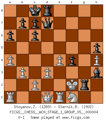 Last move : 0-1 2008 January 14 21:2:13 [Event "FICGS__CHESS__WCH_STAGE_1_GROUP_05__000004"] [Site "FICGS"] [Date "2008.01.08"] [Round "1"] [White "Stoyanov,Zdravko"] [Black "Sternik,Ryszard"] [Result "0-1"] [WhiteElo "1289"] [BlackElo "1902"] 1.e4 e5 2.Nf3 Nc6 3.Bb5 a6 4.Bxc6 dxc6 5.h3 Bc5 6.d3 Be6 7.O-O f6 8.Re1 Ne7 9.Be3 Bxe3 10.Rxe3 Ng6 11.Nh2 Nf4 12.Nd2 Qd6 13.Ng4 h5 14.Nh2 O-O-O 15.b3 g5 16.a4 Rhg8 17.Kf1 Qd4 18.Ndf3 Qd7 19.Ng1 g4 20.h4 f5 21.Ne2 Nxg2 22.Kxg2 f4 23.Nxf4 exf4 24.Re1 g3 25.Nf1 Bh3+ 26.Kg1 gxf2+ 27.Kxf2 Rg2+ 0-1 Ruy Lopez : Exchange variation Kingside Castling by player White (move 7) Queenside Castling by player Black (move 14) Player Black won this chess game. Follow this game move after move (download)Blessed be the memory of him who gave the world this immortal game. (A. G. Gardiner) Ich habe kein Problem mit Frauen, sondern nur mit dem Niveau ihres Schachspiels (Judith Polgar) El Ajedrez es una guerra en un tablero. El objetivo es aplastar la mente del oponente. (Bobby Fischer) Shah mat. Le roi est mort. Cri de fierté d'un joueur venant de terrasser son adversaire, courtoisement, sans effusion de sang. Beep ! (R2D2 in Star Wars ep.3)