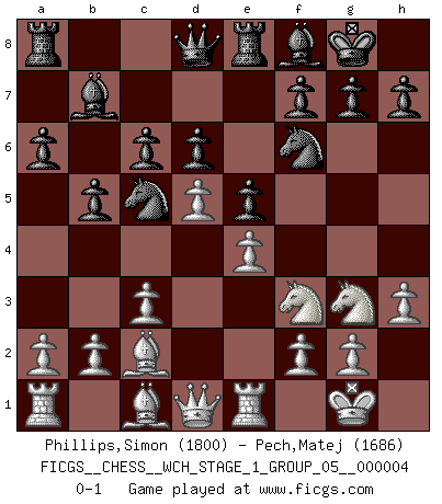 Last move : 0-1 2008 April 30 8:56:29 [Event "FICGS__CHESS__WCH_STAGE_1_GROUP_05__000004"] [Site "FICGS"] [Date "2008.01.08"] [Round "1"] [White "Phillips,Simon"] [Black "Pech,Matej"] [Result "0-1"] [WhiteElo "1800"] [BlackElo "1686"] 1.e4 e5 2.Nf3 Nc6 3.Bb5 a6 4.Ba4 Nf6 5.O-O Be7 6.Re1 b5 7.Bb3 d6 8.c3 O-O 9.h3 Bb7 10.d4 Re8 11.Nbd2 Bf8 12.d5 Nb8 13.Nf1 Nbd7 14.Ng3 Nc5 15.Bc2 c6 0-1 This chess game has been lost on time (started : 2008.01.08 19:46:13) Ruy Lopez : Closed Kingside Castling by player White (move 5) Kingside Castling by player Black (move 8) Player Black won this chess game. Follow this game move after move (download)Many have become Chess Masters, no one has become the Master of Chess. (Siegbert Tarrasch) Wer mein Gambit spielt, muß bereit sein, alle Brücken hinter sich abzubrechen. Es verändert den ganzen Menschen. Es wirkt wie ein Zauberstab und fördert verkümmerte, gute Charakter- eigenschaften wieder zu Tage. (Emil Joseph Diemer) Yo siempre he tenido un ligero sentimiento de lástima por una persona que no tiene conocimiento del Ajedrez. (Siegbert Tarrasch) Des points faibles ou des trous dans la position de l'adversaire doivent être occupés par des pièces et non pas par des pions. (Siegbert Tarrasch) Memory... is the diary that we all carry with us. (Oscar Wilde, The Importance of Being Earnest)