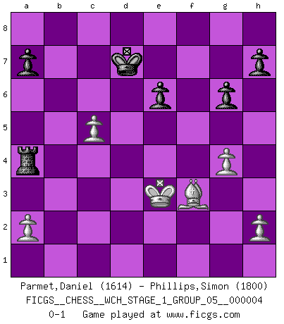 Last move : 0-1 2008 February 6 5:16:17 [Event "FICGS__CHESS__WCH_STAGE_1_GROUP_05__000004"] [Site "FICGS"] [Date "2008.01.08"] [Round "1"] [White "Parmet,Daniel"] [Black "Phillips,Simon"] [Result "0-1"] [WhiteElo "1614"] [BlackElo "1800"] 1.d4 Nf6 2.Nf3 g6 3.c4 Bg7 4.Nc3 O-O 5.e4 d6 6.Be2 e5 7.O-O exd4 8.Nxd4 Re8 9.f3 Nc6 10.Be3 Nh5 11.f4 Nf6 12.Bf3 Ng4 13.Nxc6 Nxe3 14.Nxd8 Nxd1 15.Raxd1 Rxd8 16.Nd5 c5 17.e5 Be6 18.Nc7 Rac8 19.Nxe6 fxe6 20.Rxd6 Rxd6 21.exd6 Bd4+ 22.Kh1 Rd8 23.Bxb7 Bxb2 24.Rd1 Bd4 25.Rxd4 cxd4 26.c5 d3 27.g4 d2 28.Bf3 Kf7 29.Kg2 Rc8 30.d7 Rf8 31.Kf2 Ke7 32.Ke3 Kxd7 33.Kxd2 Rxf4 34.Ke3 Ra4 0-1 King's Indian : East Indian defense Kingside Castling by player Black (move 4) Kingside Castling by player White (move 7) Player Black won this chess game. Follow this game move after move (download)First-class players lose to second class players because second-class players sometimes play a first-class game. (Tarrasch) Der Schachmeister von Heute braucht Courage, einen Killerinstinkt, Ausdauer und Arroganz. (Larry Evans) Ciertamente, de todas la drogas del mundo, el Ajedrez debe ser el mas placentero permamentemente. (Assiac) RxDa4 pat (...) All the troubles of the world come from being unable to sit alone in a quiet room. (Blaise Pascal)