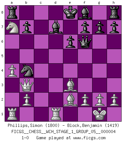 Last move : 1-0 2008 January 22 19:46:45 [Event "FICGS__CHESS__WCH_STAGE_1_GROUP_05__000004"] [Site "FICGS"] [Date "2008.01.08"] [Round "1"] [White "Phillips,Simon"] [Black "Block,Benjamin"] [Result "1-0"] [WhiteElo "1800"] [BlackElo "1419"] 1.d4 d5 2.c4 c6 3.Nc3 Nf6 4.Nf3 dxc4 5.a4 c5 6.e4 Qa5 7.Bxc4 Nxe4 8.O-O Nd6 9.Be2 e6 10.dxc5 Qxc5 11.Be3 Qf5 12.Nd4 Qf6 13.Ndb5 Nxb5 14.Nxb5 Na6 15.Nxa7 Bd7 16.Qb3 Nb4 17.Rfd1 1-0 QGD Slav defense Kingside Castling by player White (move 8) Player White won this chess game. Follow this game move after move (download)Chess demands total concentration. (Bobby Fischer) Man braucht nicht immer den besten Zug zu spielen: Ein Zug muß aktiv, unternehmungslustig, korrekt und schön sein. (David Bronstein) ¿Esta Bobby Fischer algo cuerdo?. (Salo Flohr) Les échecs, c'est la lutte contre l'erreur. (Johannes Zukertort) You can only get smarter by playing a smarter opponent. (Revolver, movie)