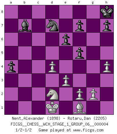 Last move : 1/2-1/2 2008 March 1 18:1:16 [Event "FICGS__CHESS__WCH_STAGE_1_GROUP_06__000004"] [Site "FICGS"] [Date "2008.01.08"] [Round "1"] [White "Nent,Alexander"] [Black "Rotaru,Dan"] [Result "1/2-1/2"] [WhiteElo "1898"] [BlackElo "2205"] 1.d4 Nf6 2.c4 e6 3.Nc3 Bb4 4.Qc2 d5 5.a3 Bxc3+ 6.Qxc3 dxc4 7.Qxc4 b6 8.Nf3 O-O 9.Bf4 Ba6 10.Qxc7 Qd5 11.Qd6 Qe4 12.Bg5 Qc2 13.Bxf6 Qxb2 14.Rd1 gxf6 15.h4 Bb5 16.Rh3 Nd7 17.Rg3+ Kh8 18.Qb4 Qxb4+ 19.axb4 a5 20.bxa5 bxa5 21.Nd2 a4 22.Ra3 f5 23.e3 Bc6 24.Rc1 Rfc8 25.Rac3 Bb7 26.Rxc8+ Rxc8 27.Rxc8+ Bxc8 28.Kd1 Bb7 1/2-1/2 Nimzo-Indian : Classical, Noa variation, 5.a3 Kingside Castling by player Black (move 8) This chess game ended in a draw. Follow this game move after move (download)Combinations have always been the most intriguing aspect of Chess. The masters look for them, the public applauds them, the critics praise them. It is because combinations are possible that Chess is more than a lifeless mathematical exercise. They are the poetry of the game; they are to Chess what melody is to music. They represent the triumph of mind over matter. (Reuben Fine) Fischer machte Schach einfach zu einer aufregenden Sache, wann immer er sich ans Brett setzte. (Raymond Keene) Uno no tiene que jugar muy bien, es suficiente jugar mejor que el oponente. (Siegbert Tarrasch) Ce n'est pas pour s'amuser qu'il joue aux échecs : il célèbre un culte. (Vladimir Nabokov) Life is painting a picture, not doing a sum. (Oliver Wendell Holmes, Jr.)