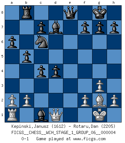 Last move : 0-1 2008 March 1 13:22:52 [Event "FICGS__CHESS__WCH_STAGE_1_GROUP_06__000004"] [Site "FICGS"] [Date "2008.01.08"] [Round "1"] [White "Kepinski,Janusz"] [Black "Rotaru,Dan"] [Result "0-1"] [WhiteElo "1612"] [BlackElo "2205"] 1.d4 Nf6 2.c4 e6 3.g3 d5 4.Nf3 dxc4 5.Bg2 a6 6.O-O Nc6 7.e3 Bd7 8.Qe2 b5 9.Rd1 Be7 10.e4 O-O 11.Nc3 Rb8 12.d5 exd5 13.e5 Re8 14.exf6 Bxf6 15.Qd2 d4 16.Ne4 Rxe4 17.Ng5 Re8 18.Re1 Bxg5 19.Rxe8+ Qxe8 20.Qd1 Bxc1 0-1 Catalan Opening Kingside Castling by player White (move 6) Kingside Castling by player Black (move 10) Player Black won this chess game. Follow this game move after move (download)I'd rather have a Pawn than a finger. (Reuben Fine) Wenn Spassky eine Figur opfert kannst du genauso gut aufgeben. Aber wenn Tal eine Figur opfert, spiel weiter. Er könnte noch eine weitere opfern, und dann ... wer weiß? (Miguel Najdorf) Todavía soy una víctima del Ajedrez. Tiene toda la belleza del arte y mucho mas. No puede ser comercializado. El Ajedrez es mas puro que el arte en su posición social. (Marcel Duchamp) Avec des compensations pour le matériel en plus... (Anonyme) Men never do evil so completely and cheerfully as when they do it from religious conviction. (Blaise Pascal)