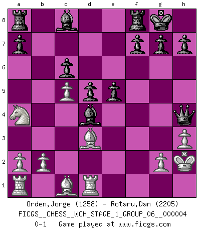 Last move : 0-1 2008 January 18 10:27:45 [Event "FICGS__CHESS__WCH_STAGE_1_GROUP_06__000004"] [Site "FICGS"] [Date "2008.01.08"] [Round "1"] [White "Orden,Jorge"] [Black "Rotaru,Dan"] [Result "0-1"] [WhiteElo "1258"] [BlackElo "2205"] 1.e4 c5 2.Nf3 Nc6 3.d4 cxd4 4.Nxd4 e5 5.Nxc6 bxc6 6.c4 Nf6 7.Nc3 Bb4 8.Bd3 O-O 9.O-O Bc5 10.Na4 Bd4 11.c5 d5 12.h3 Nxe4 13.Kh1 Nxf2+ 14.Kh2 Nxd1 15.Rxd1 Qh4 0-1 Sicilian : Labourdonnais-Loewenthal variation Kingside Castling by player Black (move 8) Kingside Castling by player White (move 9) Player Black won this chess game. Follow this game move after move (download)Alekhine is a poet who creates a work of art out of something that would hardly inspire another man to send home a picture post card. (Max Euwe) Die starken Figuren des Gegners muss man abtauschen. (José Raúl Capablanca) Robert Fischer es la ley hacia si mismo. (Larry Evans) Les pièces de l'échiquier étaient impitoyables. Elles le retenaient, elles l'absorbaient. Il y avait de l'horreur en cela, mais aussi une harmonie unique. Car, qu'y a-t-il dans le monde, à part les échecs ? (V. Nabokov) Life is the sum of all your choices. (Albert Camus)