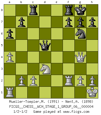 Last move : 1/2-1/2 2008 February 16 9:12:54 [Event "FICGS__CHESS__WCH_STAGE_1_GROUP_06__000004"] [Site "FICGS"] [Date "2008.01.08"] [Round "1"] [White "Mueller-Toepler,Michael"] [Black "Nent,Alexander"] [Result "1/2-1/2"] [WhiteElo "1991"] [BlackElo "1898"] 1.e4 c5 2.Nf3 d6 3.d4 cxd4 4.Nxd4 Nf6 5.Nc3 a6 6.f4 e5 7.Nf3 Nbd7 8.Bd3 Be7 9.a4 O-O 10.O-O exf4 11.Kh1 Nh5 12.Ne1 Ne5 13.Be2 Nf6 14.Bxf4 Be6 15.Nd3 Ng6 16.Bg3 d5 17.exd5 Nxd5 18.Nxd5 Bxd5 19.Bf3 Rc8 20.Rf2 Bh4 21.Bxd5 Qxd5 22.Bxh4 Nxh4 23.Qg4 Ng6 1/2-1/2 Sicilian : Najdorf, 6.f4 Kingside Castling by player Black (move 9) Kingside Castling by player White (move 10) This chess game ended in a draw. Follow this game move after move (download)All Chess players should have a hobby. (Savielly Tartakower) Gewöhnliche Menschen denken nur daran, wie sie ihre Zeit verbringen. Ein intelligenter Mensch versucht, sie auszunutzen. (Arthur Schopenhauer) Hoy en día, si tu no eres un Gran Maestro a los 14 años, es mejor que lo olvides. (Anand Viswanathan) On peut tirer plus d'utilité d'une partie perdue que de 100 parties gagnées. (Capablanca) If I had no sense of humor, I would long ago have committed suicide. (Mahatma Gandhi)