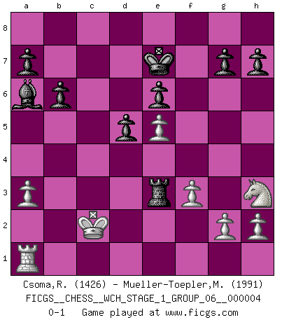 Last move : 0-1 2008 April 8 23:23:27 [Event "FICGS__CHESS__WCH_STAGE_1_GROUP_06__000004"] [Site "FICGS"] [Date "2008.01.08"] [Round "1"] [White "Csoma,Robert"] [Black "Mueller-Toepler,Michael"] [Result "0-1"] [WhiteElo "1426"] [BlackElo "1991"] 1.Nf3 Nf6 2.c4 e6 3.d4 b6 4.Nc3 Bb4 5.Qb3 c5 6.a3 Ba5 7.Bg5 Bb7 8.O-O-O Bxc3 9.Qxc3 Ne4 10.Bxd8 Nxc3 11.bxc3 Kxd8 12.Ng5 Ke7 13.f3 cxd4 14.cxd4 Nc6 15.e4 Na5 16.Kb2 Rac8 17.Rc1 f6 18.Nh3 Rc7 19.Bd3 Rhc8 20.Rhd1 Nxc4+ 21.Bxc4 Rxc4 22.Rxc4 Rxc4 23.Nf2 d5 24.e5 fxe5 25.dxe5 Rf4 26.Nh3 Rh4 27.Kc3 Ba6 28.Ra1 Rc4+ 29.Kb3 Rd4 30.Kc3 Rd3+ 31.Kc2 Re3 0-1 Reti Opening Queenside Castling by player White (move 8) Player Black won this chess game. Follow this game move after move (download)When you don't know what to play, wait for an idea to come into your opponent's mind. You may be sure that idea will be wrong. (Siegbert Tarrasch) Es gibt nur zwei wahre Schachgenies - das andere war Wilhelm Steinitz, der Weltmeister von 1872 bis 1894. (Robert James Fischer) Bobby Fischer es el jugador de Ajedrez mas grande que jamás haya existido. (Ken Smith) Il n'y a pas de prix trop élevé au scalp de l'ennemi. (Koblentz) To send light into the darkness of men's hearts - such is the duty of the artist. (Schumann)