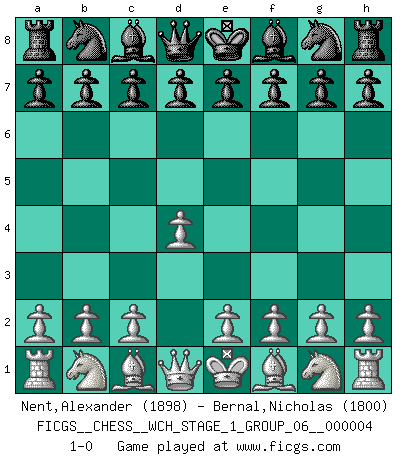Last move : 1-0 2008 February 9 12:55:24 [Event "FICGS__CHESS__WCH_STAGE_1_GROUP_06__000004"] [Site "FICGS"] [Date "2008.01.08"] [Round "1"] [White "Nent,Alexander"] [Black "Bernal,Nicholas"] [Result "1-0"] [WhiteElo "1898"] [BlackElo "1800"] 1.d4 1-0 This chess game has been lost on time (started : 2008.01.08 19:47:52) Queen's pawn Player White won this chess game. Follow this game move after move (download)You may learn much more from a game you lose than from a game you win. You will have to lose hundreds of games before becoming a good player. (Jose Raul Capablanca) Es ist im Leben wie im Schachspiel. Wir entwerfen einen Plan, dieser bleibt jedoch bedingt durch das, was im Schachspiel dem Gegner, im Leben dem Schicksal zu tun belieben wird. (Arthur Schopenhauer) Cuando le juegas a Fischer, no es una cuestion de si vas a ganar o perder. Es una cuestion de si vas a sobrevivir. (Boris Spassky) Même un GMI sait rarement calculer sur plus de cinq coups une attaque à sacrifices. (Rudolf Spielmann) No, no, you're not thinking; you're just being logical. (Niels Bohr)