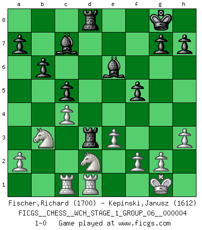 Last move : 1-0 2008 March 24 4:59:42 [Event "FICGS__CHESS__WCH_STAGE_1_GROUP_06__000004"] [Site "FICGS"] [Date "2008.01.08"] [Round "1"] [White "Fischer,Richard"] [Black "Kepinski,Janusz"] [Result "1-0"] [WhiteElo "1700"] [BlackElo "1612"] 1.d4 Nf6 2.Bg5 Ne4 3.Nf3 Nxg5 4.Nxg5 e5 5.Nf3 exd4 6.Nxd4 Bc5 7.e3 d6 8.Nb3 Bb6 9.Bd3 Be6 10.N1d2 Nd7 11.O-O c5 12.c4 O-O 13.Qc2 Nf6 14.Ne4 Ng4 15.h3 Ne5 16.Kh1 f5 17.Ned2 Nxd3 18.Qxd3 Qf6 19.Qxd6 Rad8 20.Qg3 Qxb2 21.Rfb1 Qf6 22.Qf3 Rf7 23.Rc1 Rfd7 24.Qe2 Bc7 25.Rd1 b6 26.Rab1 Qc3 27.Kg1 Qd3 28.Qxd3 Rxd3 29.Rbc1 1-0 This chess game has been lost on time (started : 2008.01.08 19:47:52) Trompowsky attack (Ruth, Opovcensky Opening) Kingside Castling by player White (move 11) Kingside Castling by player Black (move 12) Player White won this chess game. Follow this game move after move (download)Any material change in a position must come about by mate, a capture, or a Pawn promotion. (Purdy) Wie ich sie so einen nach dem anderen nieder mähte wurde meine Überlegenheit offensichtlich. (José Raúl Capablanca) Algunos sacrificios son sólidos, los demás son míos. (Mikhail Tal) Ce qui est bien, c'est d'avoir tout un tas de pièces en prise : l'adversaire ne peut en prendre qu'une à la fois. Cité par Thierry Audin. Don't be irreplaceable, if you can't be replaced, you can't be promoted. (Dan Rotaru)