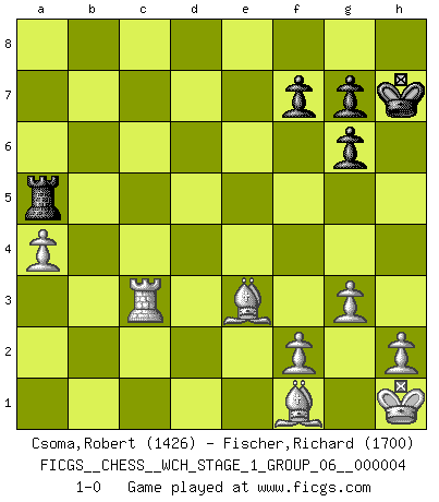 Last move : 1-0 2008 April 13 1:43:35 [Event "FICGS__CHESS__WCH_STAGE_1_GROUP_06__000004"] [Site "FICGS"] [Date "2008.01.08"] [Round "1"] [White "Csoma,Robert"] [Black "Fischer,Richard"] [Result "1-0"] [WhiteElo "1426"] [BlackElo "1700"] 1.Nf3 Nf6 2.d4 d5 3.c4 c6 4.Nc3 Bf5 5.Nh4 Bc8 6.e3 e6 7.Be2 Bd6 8.O-O O-O 9.Qc2 e5 10.dxe5 Bxe5 11.Nf3 Bc7 12.Rd1 Be6 13.e4 Qc8 14.exd5 cxd5 15.cxd5 Nxd5 16.Kh1 Nc6 17.Nxd5 Bxd5 18.Rxd5 Qe6 19.Rd1 Rfe8 20.Bc4 Qg6 21.Qxg6 hxg6 22.Be3 Ne5 23.Nxe5 Bxe5 24.Rab1 a6 25.Bd5 Rad8 26.Bxb7 Bxb2 27.Bxa6 Bc3 28.Rxd8 Rxd8 29.a4 Ba5 30.g3 Rd7 31.Rb8+ Kh7 32.Bb5 Re7 33.Ra8 Bc3 34.Bf1 Re5 35.Rc8 Ra5 36.Rxc3 1-0 Reti Opening Kingside Castling by player White (move 8) Kingside Castling by player Black (move 8) Player White won this chess game. Follow this game move after move (download)A bad plan is better than none at all. (Frank Marshall) Dein Körper muss in Topform sein. Dein Schach verfällt, wenn dein Körper verfällt. Der Körper kann nicht vom Geist getrennt werden. (Robert James Fischer) La belleza de un movimiento no se refleja solo en su apariencia, sino en el pensamiento detrás de él. (Siegbert Tarrasch) Les Echecs sont affaire de jugement sensible. Savoir quand frapper et quand esquiver. (Fischer) 'preceded by its own quotation yields a falsehood' preceded by its own quotation yields a falsehood. (W. V. O. Quine - Set Theory And Its Logic, 1953)