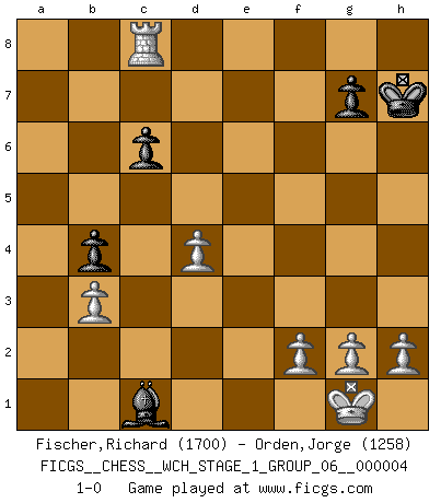 Last move : 1-0 2008 February 15 20:4:28 [Event "FICGS__CHESS__WCH_STAGE_1_GROUP_06__000004"] [Site "FICGS"] [Date "2008.01.08"] [Round "1"] [White "Fischer,Richard"] [Black "Orden,Jorge"] [Result "1-0"] [WhiteElo "1700"] [BlackElo "1258"] 1.d4 d5 2.c4 e6 3.Bf4 Nf6 4.Nc3 Be7 5.Nf3 a6 6.a4 O-O 7.e3 dxc4 8.Bxc4 Nbd7 9.O-O Nb6 10.Bd3 Nbd5 11.Nxd5 Nxd5 12.Bg3 f6 13.Qb1 f5 14.e4 fxe4 15.Bxe4 c6 16.Bxh7+ Kh8 17.Be5 Nf6 18.Bg6 Ng4 19.Qd1 Nxe5 20.Nxe5 Bg5 21.Qh5+ Bh6 22.Nf7+ Rxf7 23.Bxf7 Qg5 24.Rfe1 Qxh5 25.Bxh5 b5 26.Bf7 Bd7 27.Bxe6 Bxe6 28.Rxe6 Rc8 29.Rae1 Kh7 30.axb5 axb5 31.Re8 Rxe8 32.Rxe8 Bc1 33.b3 b4 34.Rc8 1-0 Queen's gambit declined Kingside Castling by player Black (move 6) Kingside Castling by player White (move 9) Player White won this chess game. Follow this game move after move (download)Chess is the art of analysis. (Mikhail Botvinnik) Sitze auf Deine Hände. (Siegbert Tarrasch) Los Peones son nacidos libres, y aún así, se encuentran por doquier encadenados. (Rick Kennedy) Les échecs, c'est la lutte contre l'erreur. (Johannes Zukertort) I couldn't make any sense out of what this particular thread is about. It sounds like R2 D2 computer speaking. A space fight ?!? Some 'command' problems in Moscow ? Some killers & narcotic addicts attacking some game & a god wannabe ?? (Dinesh De Silva, lost in a russian conflict in FICGS forum)