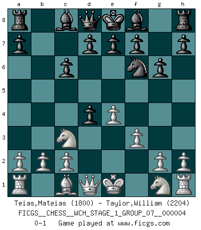 Last move : 0-1 2008 February 16 1:32:50 [Event "FICGS__CHESS__WCH_STAGE_1_GROUP_07__000004"] [Site "FICGS"] [Date "2008.01.08"] [Round "1"] [White "Teias,Mateias"] [Black "Taylor,William"] [Result "0-1"] [WhiteElo "1800"] [BlackElo "2204"] 1.e4 c5 2.Nc3 Nc6 3.f3 Nf6 4.Bb5 g6 5.Bxc6 bxc6 6.d4 cxd4 0-1 This chess game has been lost on time (started : 2008.01.08 19:50:45) Sicilian : Closed, 2...Nc6 Player Black won this chess game. Follow this game move after move (download)It is not a move, even the best move that you must seek, but a realizable plan. (Eugene Znosko-Borovsky) Im Schach gibt es keinen Platz für Galanterie. (Irving Chernev) Aquellos que dicen entender al Ajedrez, no entienden nada. (Robert Hubner) J'ai vu le vaincu d'Echecs jouer des années durant dans l'espoir de la fête de la victoire. Car tu es plus riche de ce qu'elle existe si même elle n'est point pour toi. Ainsi de la perle du fond des mers. (Antoine de Saint-Exupéry) Without deviation from the norm, progress is not possible. (Frank Zappa)