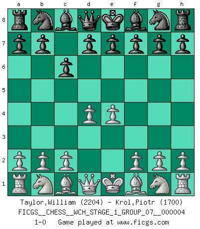 Last move : 1-0 2008 February 9 12:55:24 [Event "FICGS__CHESS__WCH_STAGE_1_GROUP_07__000004"] [Site "FICGS"] [Date "2008.01.08"] [Round "1"] [White "Taylor,William"] [Black "Krol,Piotr"] [Result "1-0"] [WhiteElo "2204"] [BlackElo "1700"] 1.e4 c6 2.d4 1-0 This chess game has been lost on time (started : 2008.01.08 19:50:45) Caro-Kann defense Player White won this chess game. Follow this game move after move (download)Man is a frivolous, a specious creature, and like a Chess player, cares more for the process of attaining his goal than for the goal itself. (Dostoyevsky) Sehr viele beherrschen heutzutage das große Einmalseins des Schachspiels und kennen sogar dessen Logarithmentafeln auswendig - deshalb sollte man hin und wieder zu beweisen trachten, dass zwei mal zwei auch fünf sein kann. (Mikhail Nekhemyevich Tal) El sobresalir en el Ajedrez es un signo de una mente intrigante. (Sir Arthur Conan Doyle) Il vaut mieux sacrifier les pièces de l'adversaire. (Xavier Tartacover) If passion drives you, let reason holds the reins. (Benjamin Franklin)