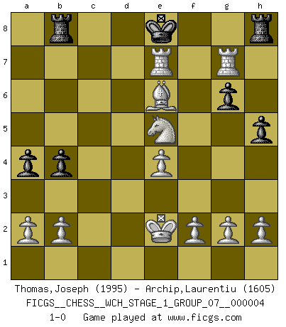 Last move : 1-0 2008 February 17 8:44:9 [Event "FICGS__CHESS__WCH_STAGE_1_GROUP_07__000004"] [Site "FICGS"] [Date "2008.01.08"] [Round "1"] [White "Thomas,Joseph"] [Black "Archip,Laurentiu"] [Result "1-0"] [WhiteElo "1995"] [BlackElo "1605"] 1.c4 Nc6 2.d4 d5 3.Nc3 dxc4 4.Nf3 g6 5.Bf4 e6 6.e4 Bg7 7.Nb5 e5 8.dxe5 Bg4 9.e6 Qxd1+ 10.Rxd1 Rc8 11.exf7+ Kxf7 12.Bxc4+ Ke7 13.Nxc7 Nf6 14.Bd6+ Kd8 15.Ne6+ Bxe6 16.Bxe6 Nd7 17.Bf4 Ncb8 18.Bxb8 Rxb8 19.Rxd7+ Ke8 20.Rxg7 b5 21.Ke2 a5 22.Rc1 b4 23.R1c7 h5 24.Ne5 a4 25.Rce7+ 1-0 English Opening Player White won this chess game. Follow this game move after move (download)Chess problems demand from the composer the same virtues that characterize all worthwhile art: originality, invention, conciseness, harmony, complexity, and splendid insincerity. (Vladimir Nabokov) Fallen sollten polizeilich verboten werden. (Savielly Grigorievitsch Tartakower) El Ajedrez es un juego de pelea el cual es puramente intelectual e incluye la suerte. (Richard Reti) Le thème de l'attaque double intervient d'une manière ou d'une autre dans l'immense majorité des combinaisons. (Youri Averbakh) It's not the will to win, but the will to prepare to win that makes the difference. (Bear Bryant)