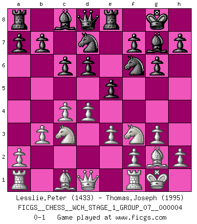 Last move : 0-1 2008 January 21 1:6:46 [Event "FICGS__CHESS__WCH_STAGE_1_GROUP_07__000004"] [Site "FICGS"] [Date "2008.01.08"] [Round "1"] [White "Lesslie,Peter"] [Black "Thomas,Joseph"] [Result "0-1"] [WhiteElo "1433"] [BlackElo "1995"] 1.Nf3 Nf6 2.c4 g6 3.g3 Bg7 4.Bg2 O-O 5.O-O d6 6.Nc3 c6 7.d4 Nbd7 8.e3 Re8 9.b3 e5 0-1 Reti Opening Kingside Castling by player Black (move 4) Kingside Castling by player White (move 5) Player Black won this chess game. Follow this game move after move (download)He who fears an isolated Queen's Pawn should give up Chess. (Siegbert Tarrasch) Als er Schachweltmeister wurde ließ er praktisch alle stärksten Sovietspieler für sich arbeiten. Wenn ein auch nur mittelmässiger Meister ein Spezialist für eine bestimmte Eröffnung war, wurde er von Karpov gerufen. Das wurde alles geheim gehalten. (Mikhail Moiseyevich Botvinik) El Ajedrez es un cuento de Hadas de las 1001 metidas de pata. (Savielly Tartakower) Des idées, des idées, j'en ai cent, j'en ai mille. Des bonnes, des mauvaises, applicables, irréalisables... Il suffit de faire le tri ! (Roos) Whatever you do, don't be bored. This is absolutely the most exciting time we could have possibly hoped to be alive. And things are just starting. (From movie Waking life)