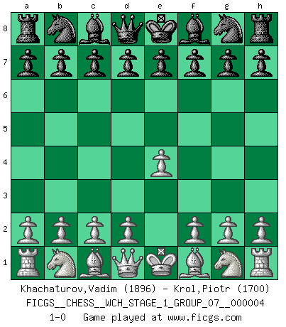 Last move : 1-0 2008 February 18 1:38:17 [Event "FICGS__CHESS__WCH_STAGE_1_GROUP_07__000004"] [Site "FICGS"] [Date "2008.01.08"] [Round "1"] [White "Khachaturov,Vadim"] [Black "Krol,Piotr"] [Result "1-0"] [WhiteElo "1896"] [BlackElo "1700"] 1.e4 1-0 This chess game has been lost on time (started : 2008.01.08 19:50:45) King's pawn Opening Player White won this chess game. Follow this game move after move (download)A good player is always lucky. (Jose Raul Capablanca) Drei Punkte vor allen anderen ist wie einer, der im weißen Anzug posiert, während der Rest in Müllsäcke gekleidet dasteht. (Viktor Kortschnoi) Ayuda a tus piezas para que ellas te puedan ayudar. (Paul Morphy) Pour moi, les échecs ne sont pas un jeu mais un art. (Alexandre Alekhine) Tomorrow's what you make of it. (Horatio Caine, C.S.I. Miami)