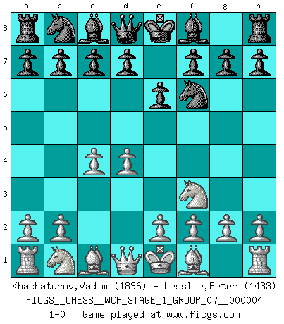 Last move : 1-0 2008 February 22 14:1:48 [Event "FICGS__CHESS__WCH_STAGE_1_GROUP_07__000004"] [Site "FICGS"] [Date "2008.01.08"] [Round "1"] [White "Khachaturov,Vadim"] [Black "Lesslie,Peter"] [Result "1-0"] [WhiteElo "1896"] [BlackElo "1433"] 1.d4 Nf6 2.c4 e6 3.Nf3 1-0 This chess game has been lost on time (started : 2008.01.08 19:50:45) Queen's pawn game Player White won this chess game. Follow this game move after move (download)The boy (then a 12 year old boy named Anatoly Karpov) doesn't have a clue about Chess, and there's no future at all for him in this profession. (Mikhail Botvinnik) Jeder Fehler erscheint unglaublich dumm, wenn andre ihn begehen. (Georg Christoph Lichtenberg) El sobresalir en el Ajedrez es un signo de una mente intrigante. (Sir Arthur Conan Doyle) Toutes choses étant égales, c'est la conviction qui gagne. Alliée à une volonté de vaincre, elle sert de détonateur, suscite des idées, disperse les doutes et aide à penser clairement. (Robert Fischer) In my experience, there's no such thing as luck. (Obi-Wan Kenobi in Star Wars ep.4)