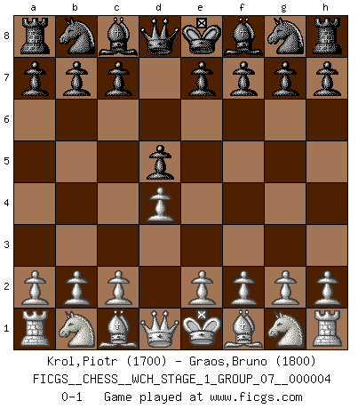 Last move : 0-1 2008 February 10 13:5:21 [Event "FICGS__CHESS__WCH_STAGE_1_GROUP_07__000004"] [Site "FICGS"] [Date "2008.01.08"] [Round "1"] [White "Krol,Piotr"] [Black "Graos,Bruno"] [Result "0-1"] [WhiteElo "1700"] [BlackElo "1800"] 1.d4 d5 0-1 This chess game has been lost on time (started : 2008.01.08 19:50:45) Queen's pawn game Player Black won this chess game. Follow this game move after move (download)The hallmark of the artist is simplicity. (Larry Evans) Ein Gewinn durch eine ungenaue Kombination, sei sie auch noch so vorzeigbar, erfüllt mich mit Schaudern. (Wilhelm Steinitz) Solo los afeminados hacen el Enroque. (Rob Sillars) On croit qu'il y a plus de mauvais joueurs que de bons joueurs, c'est faux : Il y a autant de joueurs qui gagnent que de joueurs qui perdent. (Philippe Geluck) The quality of decision is like the well-timed swoop of a falcon which enables it to strike and destroy its victim. (Sun Tzu)
