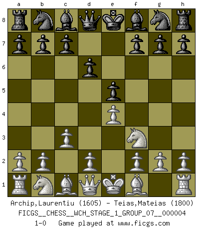 Last move : 1-0 2008 February 15 1:30:57 [Event "FICGS__CHESS__WCH_STAGE_1_GROUP_07__000004"] [Site "FICGS"] [Date "2008.01.08"] [Round "1"] [White "Archip,Laurentiu"] [Black "Teias,Mateias"] [Result "1-0"] [WhiteElo "1605"] [BlackElo "1800"] 1.e4 e5 2.Nf3 d6 3.c3 1-0 This chess game has been lost on time (started : 2008.01.08 19:50:45) Philidor's defense Player White won this chess game. Follow this game move after move (download)Help your pieces so they can help you. (Paul Morphy) Viele Opfer benötigen überhaupt keine konkrete Berechnung. Es genügt sich die entstehende Position kurz vorzustellen, um uns davon zu überzeugen, dass das Opfer korrekt ist. (Mikhail Nekhemyevich Tal) El Ajedrez es un juego de pelea el cual es puramente intelectual e incluye la suerte. (Richard Reti) Il n'y a pas eu de défaite parce que je ne crois pas que cet ordinateur ait jamais existé. IBM a triché en refusant d'imprimer les modes de recherche de la machine. C'est évident, pendant le match, des coups décisifs ont été joués par des êtres humains. Aujourd'hui, les meilleurs spécialistes en informatique ne peuvent toujours pas expliquer comment Deep-Blue a pu jouer contre la logique des ordinateurs. IBM a gagné une guerre de communication, mais ils sont incapables de prouver que l'ordinateur a gagné tout seul. (Garry Kasparov) The smarter you play, the luckier you'll be. (Mark Pilarski)