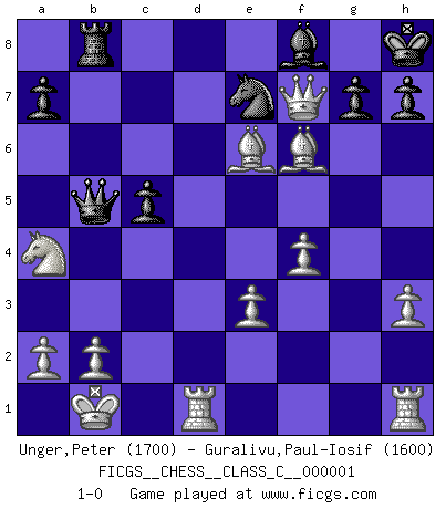 Last move : 1-0 2006 April 19 15:58:27 [Event "FICGS__CHESS__CLASS_C__000001"] [Site "FICGS"] [Date "2006.04.13"] [Round "1"] [White "Unger,Peter"] [Black "Guralivu,Paul-Iosif"] [Result "1-0"] [WhiteElo "1700"] [BlackElo "1600"] 1.d4 d5 2.Nf3 Bg4 3.c4 e6 4.e3 Nf6 5.Qb3 b6 6.Ne5 Bd6 7.Nxg4 Nxg4 8.f4 O-O 9.Nc3 Nd7 10.cxd5 exd5 11.Qxd5 Re8 12.Qf3 Ndf6 13.h3 Nh6 14.g4 Nd7 15.Bd2 Kh8 16.O-O-O Ng8 17.Kb1 Bf8 18.Bc4 Re7 19.g5 f6 20.Qd5 Rf7 21.Qxf7 Ne7 22.Be6 c5 23.gxf6 Nxf6 24.dxc5 bxc5 25.Be1 Qb6 26.Bh4 Rb8 27.Na4 Qb5 28.Bxf6 1-0 Queen's pawn game Kingside Castling by player Black (move 8) Queenside Castling by player White (move 16) Player White won this chess game. Follow this game move after move (download)Don't even mention losing to me. I can't stand to think of it. (Bobby Fischer) Ich spiele 70 Eröffnungssysteme. (Viktor Kortschnoi) ¿Esta Bobby Fischer algo cuerdo?. (Salo Flohr) Les pièces de l'échiquier étaient impitoyables. Elles le retenaient, elles l'absorbaient. Il y avait de l'horreur en cela, mais aussi une harmonie unique. Car, qu'y a-t-il dans le monde, à part les échecs ? (V. Nabokov) Better than a thousand days of diligent study is one day with a great teacher. (Japanese proverb)