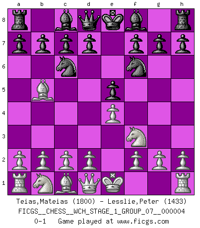 Last move : 0-1 2008 February 13 1:21:5 [Event "FICGS__CHESS__WCH_STAGE_1_GROUP_07__000004"] [Site "FICGS"] [Date "2008.01.08"] [Round "1"] [White "Teias,Mateias"] [Black "Lesslie,Peter"] [Result "0-1"] [WhiteElo "1800"] [BlackElo "1433"] 1.e4 e5 2.Nf3 Nc6 3.Bb5 Nf6 0-1 This chess game has been lost on time (started : 2008.01.08 19:50:45) Ruy Lopez : Berlin defense Player Black won this chess game. Follow this game move after move (download)Play the opening like a book, the middle game like a magician, and the endgame like a machine. (Spielmann) Moralische Siege zählen nicht. (Savielly Grigorievitsch Tartakower) Solo el jugador con la iniciativa tiene el derecho a atacar. (Wilhelm Steinitz) Les ravages du H expliquent la différence de niveau entre Tal et Thal [Abergel]. We're missing something. (Gregory House, House M.D.)
