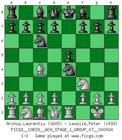 Last move : 1-0 2008 January 21 1:7:6 [Event "FICGS__CHESS__WCH_STAGE_1_GROUP_07__000004"] [Site "FICGS"] [Date "2008.01.08"] [Round "1"] [White "Archip,Laurentiu"] [Black "Lesslie,Peter"] [Result "1-0"] [WhiteElo "1605"] [BlackElo "1433"] 1.e4 e5 2.Nf3 Nc6 3.Bc4 Nf6 4.O-O Nxe4 5.Re1 1-0 Two knights defense Kingside Castling by player White (move 4) Player White won this chess game. Follow this game move after move (download)At this time Fischer is simply a level above all the best Chessplayers in the world. (John Jacobs) Kasparov ist eine Art Monster mit hundert Augen, denen auch nicht das Geringste entgeht. (Tony Miles) Nunca nadie ha ganado una partida de Ajedrez rindiendose. (Unknown) Le système Elo représente seulement une moyenne. Il est simplement un indicateur de votre stabilité. (Anatoli Karpov) If you lose the game you should win the analysis! (Proverb)