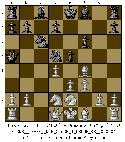 Last move : 0-1 2008 March 4 3:1:47 [Event "FICGS__CHESS__WCH_STAGE_1_GROUP_08__000004"] [Site "FICGS"] [Date "2008.01.08"] [Round "1"] [White "Oliveira,Carlos"] [Black "Domanov,Dmitry"] [Result "0-1"] [WhiteElo "1600"] [BlackElo "2199"] 1.d4 Nf6 2.Bg5 Ne4 3.Bf4 c5 4.f3 Qa5+ 5.c3 Nf6 6.Nd2 cxd4 7.cxd4 Nc6 8.e3 Nd5 9.Ne2 g5 10.Bxg5 f6 11.Bf4 e5 0-1 This chess game has been lost on time (started : 2008.01.08 19:51:57) Trompowsky attack (Ruth, Opovcensky Opening) Player Black won this chess game. Follow this game move after move (download)Tactics flow from a superior position. (Bobby Fischer) Im Spitzenschach von heute geht es nur um Vorbereitung, um tiefgründige, sorgfältige Eröffnungsvorbereitung. (Nigel Short) Un buen sacrificio es aquel que aunque no sea necesariamente sólido, deja a tu oponente aturdido y confuso. (Rudolph Spielmann) Si rien de grave n'est détecté lors de l'analyse d'une position, on joue alors le coup. Seconde règle de Blumenfeld. The only sure thing about luck is that it will change. (Wilson Mizner)