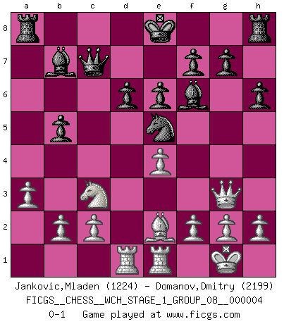 Last move : 0-1 2008 March 9 15:53:8 [Event "FICGS__CHESS__WCH_STAGE_1_GROUP_08__000004"] [Site "FICGS"] [Date "2008.01.08"] [Round "1"] [White "Jankovic,Mladen"] [Black "Domanov,Dmitry"] [Result "0-1"] [WhiteElo "1224"] [BlackElo "2199"] 1.e4 c5 2.Nf3 d6 3.d4 cxd4 4.Nxd4 Nf6 5.Nc3 a6 6.Bg5 e6 7.Qf3 Nbd7 8.Be2 Qc7 9.O-O b5 10.a3 Bb7 11.Rfe1 Be7 12.Qg3 Ne5 13.Rad1 h6 14.Bxf6 Bxf6 15.Ndxb5 axb5 0-1 This chess game has been lost on time (started : 2008.01.08 19:51:57) Sicilian : Najdorf, 6...e6 Kingside Castling by player White (move 9) Player Black won this chess game. Follow this game move after move (download)Chess teaches you to control the initial excitement you feel when you see something that looks good and it trains you to think objectively when you're in trouble. (Stanley Kubrick) Ein typischer, sehr verbreiteter Gedankenschädling ist der, daß der betreffende Amateur von der Annanhme ausgeht, daß jeder einzelne Zug etwas zu leisten habe. (Aaron Nimzowitsch) Solo el jugador con la iniciativa tiene el derecho a atacar. (Wilhelm Steinitz) La menace est plus forte que l'exécution. (Aaron Nimzovitch) If I had no sense of humor, I would long ago have committed suicide. (Mahatma Gandhi)