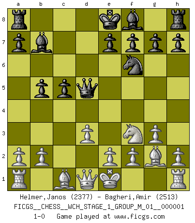 Last move : 1-0 2006 September 7 1:27:26 [Event "FICGS__CHESS__WCH_STAGE_1_GROUP_M_01__000001"] [Site "FICGS"] [Date "2006.07.01"] [Round "1"] [White "Helmer,Janos"] [Black "Bagheri,Amir"] [Result "1-0"] [WhiteElo "2377"] [BlackElo "2513"] 1.Nf3 d5 2.c4 dxc4 3.Na3 c5 4.Nxc4 Nc6 5.g3 b5 6.Nce5 Nxe5 7.Nxe5 Qd5 8.Nf3 Nf6 9.Bg2 Bb7 10.d3 1-0 This chess game has been lost on time (started : 2006.07.01 16:27:27) Reti accepted Player White won this chess game. Follow this game move after move (download)Chess holds its master in its own bonds, shackling the mind and brain so that the inner freedom of the very strongest must suffer. (Albert Einstein) Kleine Schachspieler machen Mist, und große Schachspieler machen Mist, aber große machen weniger Mist. (Fritz Sämisch) No hay un Gran Maestro de Ajedrez que sea normal; solo se diferencían ellos por la magnitud de su locura. (Viktor Korchnoi) Le jeu d'échecs est comme rejeté hors du temps. (Antoine de Saint-Exupéry) For to win one hundred victories in one hundred battles is not the acme of skill. To subdue the enemy without fighting is the acme of skill. (Sun Tzu)