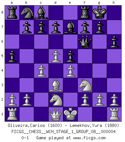 Last move : 0-1 2008 March 4 3:1:47 [Event "FICGS__CHESS__WCH_STAGE_1_GROUP_08__000004"] [Site "FICGS"] [Date "2008.01.08"] [Round "1"] [White "Oliveira,Carlos"] [Black "Lemekhov,Yura"] [Result "0-1"] [WhiteElo "1600"] [BlackElo "1880"] 1.d4 Nf6 2.Bg5 e6 3.Nd2 h6 4.Bxf6 Qxf6 5.c3 Be7 6.e4 O-O 7.Ngf3 Nc6 8.Bd3 e5 9.d5 Nb8 10.c4 a5 0-1 This chess game has been lost on time (started : 2008.01.08 19:51:57) Trompowsky attack (Ruth, Opovcensky Opening) Kingside Castling by player Black (move 6) Player Black won this chess game. Follow this game move after move (download)Any material change in a position must come about by mate, a capture, or a Pawn promotion. (Purdy) Die meiste Zeit treffe ich auf Gegner, die meine Enkel sein könnten. Ich bin da, um ihnen zu zeigen, dass sie von mir noch einiges lernen können. (Viktor Kortschnoi) En posiciones complicadas, Bobby Fischer pocas veces tuvo que temer de cualquiera. (Paul Keres) Le temps de noter son nom sur la feuille de partie, j'étais déjà en zeitnot ! D'un modeste amateur apparié lors de la première ronde d'un open contre le grand-maître Azmaïparashvili. Don't anthropomorphize computers - they hate it. (Anonymous)