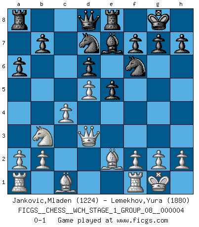 Last move : 0-1 2008 March 16 16:25:28 [Event "FICGS__CHESS__WCH_STAGE_1_GROUP_08__000004"] [Site "FICGS"] [Date "2008.01.08"] [Round "1"] [White "Jankovic,Mladen"] [Black "Lemekhov,Yura"] [Result "0-1"] [WhiteElo "1224"] [BlackElo "1880"] 1.e4 c5 2.Nf3 d6 3.d4 cxd4 4.Nxd4 Nf6 5.Nc3 a6 6.Be2 e5 7.Nb3 Be7 8.O-O O-O 9.Qd3 Be6 10.Nd5 Bxd5 11.exd5 Nbd7 12.c4 Re8 0-1 This chess game has been lost on time (started : 2008.01.08 19:51:57) Sicilian : Najdorf, Opovcensky variation Kingside Castling by player White (move 8) Kingside Castling by player Black (move 8) Player Black won this chess game. Follow this game move after move (download)Place the contents of the Chess box in a hat, shake them up vigorously, pour them on the board from a height of two feet, and you get the style of Steinitz. (H. E. Bird) Der beste Spieler in einem Turnier gewinnt es nie. Er landet auf Platz zwei oder drei. (Siegbert Tarrasch) Un buen sacrificio es aquel que aunque no sea necesariamente sólido, deja a tu oponente aturdido y confuso. (Rudolph Spielmann) Les échecs, c'est l'art d'analyser. (Mikhail Botvinnik) Memory is a way of holding onto the things you love, the things you are, the things you never want to lose. (from the television show: The Wonder Years)