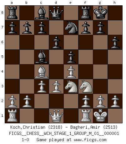 Last move : 1-0 2006 September 8 17:57:0 [Event "FICGS__CHESS__WCH_STAGE_1_GROUP_M_01__000001"] [Site "FICGS"] [Date "2006.07.01"] [Round "1"] [White "Koch,Christian"] [Black "Bagheri,Amir"] [Result "1-0"] [WhiteElo "2318"] [BlackElo "2513"] 1.e4 e5 2.Nf3 Nc6 3.Bc4 Bc5 4.d3 d6 5.Nc3 Nf6 6.Bg5 h6 7.Bxf6 Qxf6 8.Nd5 Qd8 9.c3 Ne7 10.Ne3 O-O 11.O-O 1-0 This chess game has been lost on time (started : 2006.07.01 16:27:27) Giuoco Pianissimo Kingside Castling by player Black (move 10) Kingside Castling by player White (move 11) Player White won this chess game. Follow this game move after move (download)It's just you and your opponent at the board and you're trying to prove something. (Bobby Fischer) Ein Springer auf f6 gegen die eigene Rochadestellung ist schlimmer als ein rostiger Nagel im Knie. (Efim Bogoljubov) Creo que una cierta cantidad de temperamento es esperada de los genios del Ajedrez. (Ron Gross) Vous m'avez demandé de vous exposer quel est le fondement de la prière. Je ne fais que préparer les pièces du jeu sur la table... Nous sera-t-il permis d'en adopter les règles et si nous les appliquons scrupuleusement nous ne tarderons pas à faire mat le Roi divin ! Il ne pourra échapper à nos mains. (Sainte Thérèse d'Avila, Chemin de perfection) 98% of all statistics are made up. (Author unknown)