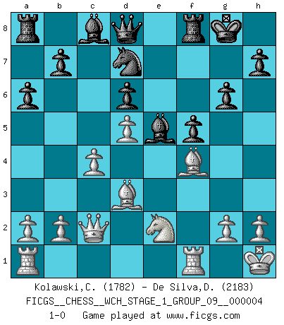 Last move : 1-0 2008 April 5 18:59:16 [Event "FICGS__CHESS__WCH_STAGE_1_GROUP_09__000004"] [Site "FICGS"] [Date "2008.01.08"] [Round "1"] [White "Kolawski,Christof"] [Black "De Silva,Dinesh"] [Result "1-0"] [WhiteElo "1782"] [BlackElo "2183"] 1.e4 c5 2.Nf3 Nc6 3.d4 cxd4 4.Nxd4 Nf6 5.Nc3 e5 6.Ndb5 d6 7.Nd5 Nxd5 8.exd5 Nb8 9.c4 Be7 10.Be2 O-O 11.O-O a6 12.Nc3 f5 13.f4 Nd7 14.Kh1 Bf6 15.Qc2 exf4 16.Bxf4 Be5 17.Bd3 g6 18.Ne2 1-0 This chess game has been lost on time (started : 2008.01.08 19:53:44) Sicilian : Pelikan (Lasker/Sveshnikov) variation Kingside Castling by player Black (move 10) Kingside Castling by player White (move 11) Player White won this chess game. Follow this game move after move (download)Chess, like love, is infectious at any age. (Flohr) Ja, jede Frau in Holland liebt mich bestimmt, und alle Männer hassen mich. (Loek van Wely) Aunque la mayoría de la gente disfruta observar las partidas de los grandes Maestros de ataque, algunos de los jugadores mas notables en la historia han sido los jugadores silenciosos posicionales. Lentamente ellos te aplastan despojandote de tu espacio, congestionando tus piezas y dejandote virtualmente sin nada que hacer. (Yasser Seirawan) Vouloir jouer aux échecs contre soi-même est aussi paradoxal que vouloir marcher sur son ombre. (Stefan Zweig) Coffee just isn't my cup of tea. (Unknown)