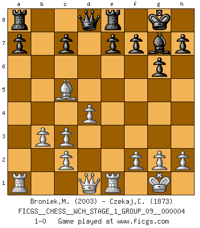 Last move : 1-0 2008 March 6 3:15:1 [Event "FICGS__CHESS__WCH_STAGE_1_GROUP_09__000004"] [Site "FICGS"] [Date "2008.01.08"] [Round "1"] [White "Broniek,Mariusz Maciej"] [Black "Czekaj,Christophe"] [Result "1-0"] [WhiteElo "2003"] [BlackElo "1873"] 1.e4 Nf6 2.e5 Nd5 3.d4 d6 4.Nf3 dxe5 5.Nxe5 g6 6.Bc4 Be6 7.O-O Bg7 8.Re1 O-O 9.Bb3 Nc6 10.Nxc6 bxc6 11.Nc3 Nxc3 12.bxc3 Bxb3 13.axb3 c5 14.Ba3 Re8 15.Bxc5 1-0 This chess game has been lost on time (started : 2008.01.08 19:53:44) Alekhine's defense : Modern, Larsen variation Kingside Castling by player White (move 7) Kingside Castling by player Black (move 8) Player White won this chess game. Follow this game move after move (download)All that matters on the Chessboard is good moves. (Bobby Fischer) Später, ... hatte ich zunehmend Erfolg in entscheidenden Partien. Vielleicht weil ich eine einfache Wahrheit erkannte: nicht nur ich hatte Angst, auch mein Gegner. (Mikhail Nekhemyevich Tal) El jugador táctico sabe que hacer cuando hay algo que hacer; mientras que el estratega sabe que hacer cuando no hay nada que hacer. (Gerald Abrahams) Des combinaisons [dans le jeu d'échecs] pareilles à des mélodies. Je crois entendre pour ainsi dire la musique des coups... (Vladimir Nabokov) There is a very easy way to return from a casino with a small fortune : go there with a large one. (Jack Yelton)