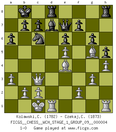 Last move : 1-0 2008 March 4 13:29:20 [Event "FICGS__CHESS__WCH_STAGE_1_GROUP_09__000004"] [Site "FICGS"] [Date "2008.01.08"] [Round "1"] [White "Kolawski,Christof"] [Black "Czekaj,Christophe"] [Result "1-0"] [WhiteElo "1782"] [BlackElo "1873"] 1.e4 Nf6 2.e5 Nd5 3.d4 d6 4.Nf3 dxe5 5.Nxe5 g6 6.Bc4 e6 7.Nc3 Bg7 8.Qf3 Bxe5 9.dxe5 Nxc3 10.Qxc3 Nc6 11.Be3 Qh4 12.O-O-O Bd7 13.g3 Qe7 14.a3 O-O-O 15.Bd3 Kb8 16.Be4 h5 17.h4 a6 18.Bg5 1-0 Alekhine's defense : Modern, Larsen variation Queenside Castling by player White (move 12) Queenside Castling by player Black (move 14) Player White won this chess game. Follow this game move after move (download)I prefer to lose a really good game than to win a bad one. (David Levy) Moralische Siege zählen nicht. (Savielly Grigorievitsch Tartakower) ¿Cual es el objetivo de jugar una apertura de gambito?... Para adquirir una reputación de ser un jugador apuesto a costo de perder el juego. (Siegbert Tarrasch) Il a essayé de se convaincre qu'il pourrait empêcher toutes les erreurs et ne jamais perdre. L'horreur ! Gary Kasparov au sujet de Robert Fischer. A woman without a man is like a fish without a bicycle. (Gloria Steinem)