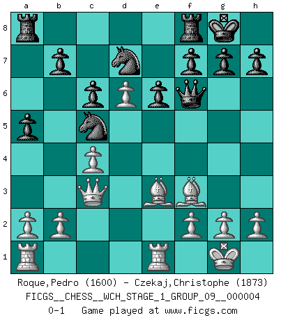 Last move : 0-1 2008 April 29 20:56:1 [Event "FICGS__CHESS__WCH_STAGE_1_GROUP_09__000004"] [Site "FICGS"] [Date "2008.01.08"] [Round "1"] [White "Roque,Pedro"] [Black "Czekaj,Christophe"] [Result "0-1"] [WhiteElo "1600"] [BlackElo "1873"] 1.e4 Nf6 2.e5 Nd5 3.d4 d6 4.Nf3 dxe5 5.dxe5 Bg4 6.Be2 e6 7.O-O Nd7 8.c4 N5b6 9.Qd4 Bxf3 10.Bxf3 c6 11.Qc3 Qh4 12.Nd2 a5 13.Ne4 Nc5 14.Nd6+ Bxd6 15.exd6 O-O 16.Be3 Nbd7 17.Rfe1 Qf6 0-1 This chess game has been lost on time (started : 2008.01.08 19:53:44) Alekhine's defense : Modern, Larsen variation Kingside Castling by player White (move 7) Kingside Castling by player Black (move 15) Player Black won this chess game. Follow this game move after move (download)When you don't know what to play, wait for an idea to come into your opponent's mind. You may be sure that idea will be wrong. (Siegbert Tarrasch) Zeige mir drei Eröffnungsvarianten und ich beweise dir, dass zwei davon inkorrekt sind. (Emanuel Lasker) El Ajedrez es despiadado: debes de estar preparado para matar gente. (Nigel Short) La vie et les Echecs sont tous les deux une lutte constante. (Lasker) You must do what you feel is right... of course. (Obi-Wan Kenobi in Star Wars ep.4)