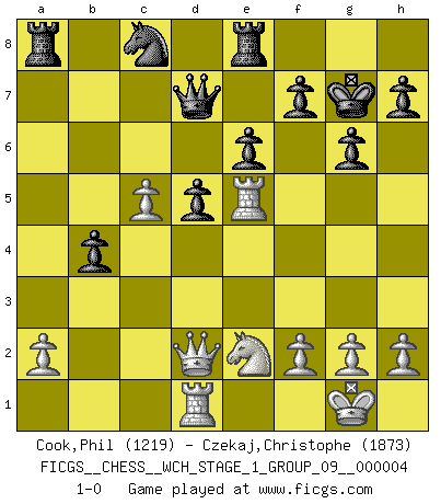 Last move : 1-0 2008 March 26 5:5:45 [Event "FICGS__CHESS__WCH_STAGE_1_GROUP_09__000004"] [Site "FICGS"] [Date "2008.01.08"] [Round "1"] [White "Cook,Phil"] [Black "Czekaj,Christophe"] [Result "1-0"] [WhiteElo "1219"] [BlackElo "1873"] 1.e4 Nf6 2.e5 Nd5 3.Nf3 d6 4.exd6 cxd6 5.Bb5+ Bd7 6.Bxd7+ Qxd7 7.d4 g6 8.O-O Bg7 9.c4 Nb6 10.b3 O-O 11.Nc3 Nc6 12.Be3 e6 13.Qd2 Rfe8 14.Bh6 d5 15.c5 Nc8 16.Bxg7 Kxg7 17.Rfe1 N8e7 18.Nb5 Nc8 19.Rad1 a6 20.Nc3 b6 21.Ne5 Nxe5 22.Rxe5 Qc7 23.b4 a5 24.Nb5 Qd7 25.Nc3 axb4 26.Ne2 bxc5 27.dxc5 1-0 This chess game has been lost on time (started : 2008.01.08 19:53:44) Alekhine's defense Kingside Castling by player White (move 8) Kingside Castling by player Black (move 10) Player White won this chess game. Follow this game move after move (download)The winner of the game is the player who makes the next-to-last mistake. (Savielly Tartakover) Mit sehr nachdenklichem Gesicht schreitet Bobby durch den Turniersaal. Was ist passiert?, fragt Lombardy. Ich stehe schlecht, antwortet Fischer. Lombardy: Dann biete doch einfach Remis an. Fischer: So schlecht stehe ich nun auch wieder nicht! (Robert James Fischer) La táctica fluye a partir de una posición superior. (Bobby Fischer) Les Echecs ont trois composantes : le temps, l'espace et le matériel en dernier. (Mikhail Tal) Convictions are more dangerous enemies of truth than lies. (Friedrich Nietzsche)