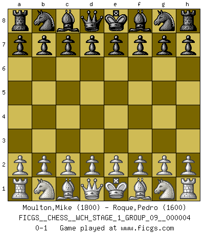 Last move : 0-1 2008 February 8 12:51:40 [Event "FICGS__CHESS__WCH_STAGE_1_GROUP_09__000004"] [Site "FICGS"] [Date "2008.01.08"] [Round "1"] [White "Moulton,Mike"] [Black "Roque,Pedro"] [Result "0-1"] [WhiteElo "1800"] [BlackElo "1600"] 0-1 This chess game has been lost on time (started : 2008.01.08 19:53:44) Player Black won this chess game. Follow this game move after move (download)Chess is in its essence a game, in its form an art, and in its execution a science. (Baron Tassilo) Ein Schachspiel besteht aus drei Phasen: Die erste, wenn du hofftst den Vorteil zu haben, die zweite, wenn du glaubst einen Vorteil zu haben, und die dritte.... wenn du weißt Du wirst verlieren. (Savielly Grigorievitsch Tartakower) Sin errores no puede haber brillantez. (Emanuel Lasker) 'L'échange des dames est un coup dur pour les deux adversaires...' Un journaliste lors d'une partie du match Spassky-Fischer It's not the size of the dog in the fight, it's the size of the fight in the dog. (Mark Twain)