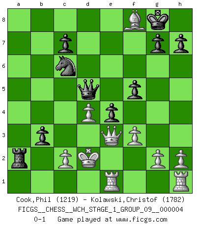 Last move : 0-1 2008 February 7 18:4:17 [Event "FICGS__CHESS__WCH_STAGE_1_GROUP_09__000004"] [Site "FICGS"] [Date "2008.01.08"] [Round "1"] [White "Cook,Phil"] [Black "Kolawski,Christof"] [Result "0-1"] [WhiteElo "1219"] [BlackElo "1782"] 1.e4 e6 2.Nc3 d5 3.exd5 exd5 4.d4 Bb4 5.Bd2 Nf6 6.a3 Bxc3 7.Bxc3 O-O 8.Bd3 Ne4 9.Bxe4 dxe4 10.Qd2 Be6 11.O-O-O Bd5 12.Re1 Nc6 13.Ne2 a5 14.Nf4 b5 15.Nxd5 Qxd5 16.b3 f5 17.Qe3 b4 18.Bb2 a4 19.f3 bxa3 20.Bxa3 axb3 21.Bxf8 Ra1+ 22.Kd2 Ra2 0-1 French defense Kingside Castling by player Black (move 7) Queenside Castling by player White (move 11) Player Black won this chess game. Follow this game move after move (download)Chess is life. (Bobby Fischer) Glücklicherweise sind Großmeister Ruben Fines reine Schachbücher weniger phallozentrisch [als seine Schachpsychologie] und deswegen auch weniger lächerlich. (Nigel Short) Yo nunca en mi vida he jugado la Defensa Francesa, que viene siendo la más aburrida de todas las Aperturas. (Wilhelm Steinitz) Shah mat. Le roi est mort. Cri de fierté d'un joueur venant de terrasser son adversaire, courtoisement, sans effusion de sang. Logic : The art of thinking and reasoning in strict accordance with the limitations and incapacities of the human misunderstanding. (Ambrose Bierce)